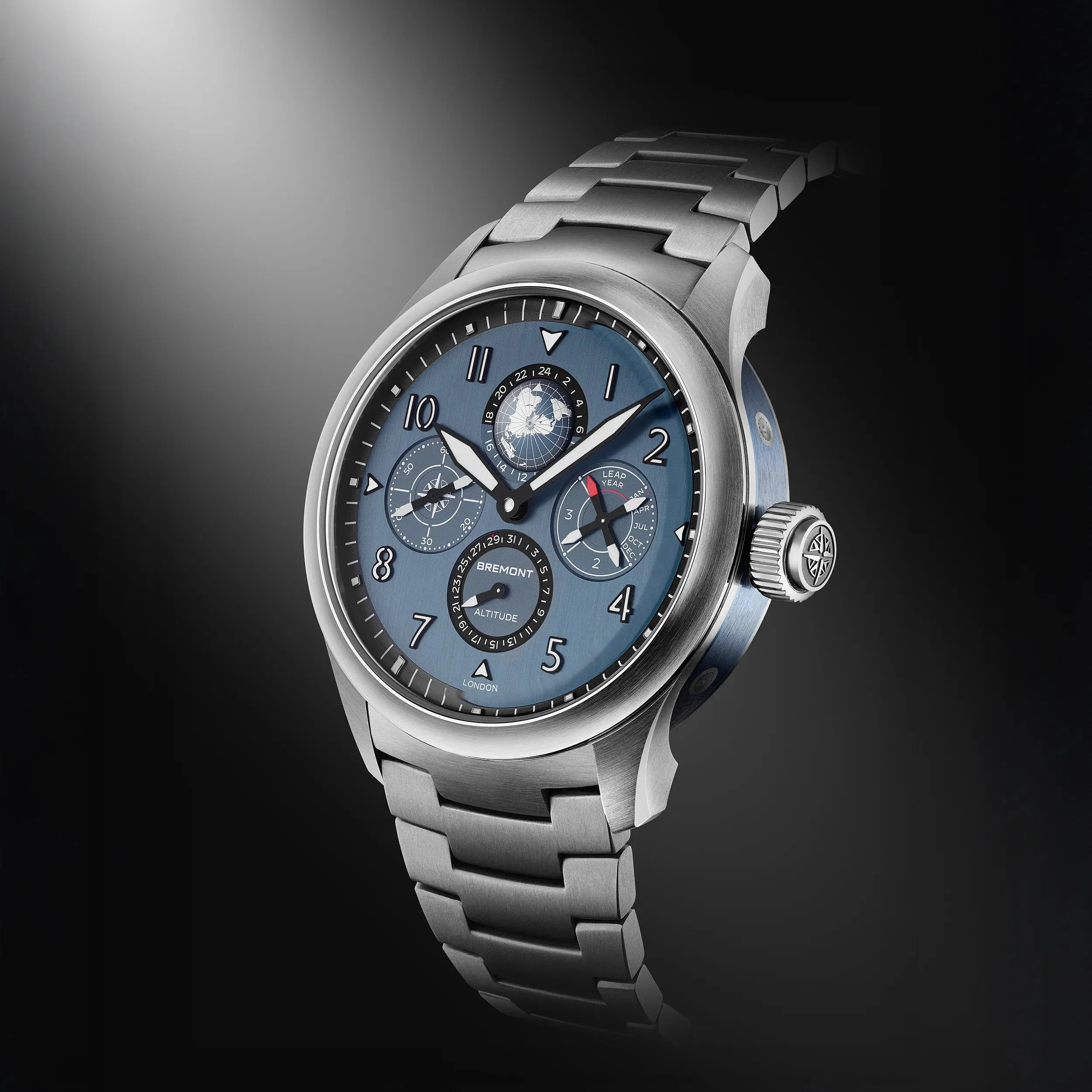 Crafted to deliver enduring performance and refined precision, the Altitude Perpetual Calendar GMT is finished with a glassbox sapphire crystal and is offered on both a titanium bracelet and patinated blue leather strap. A showcase of British design, Swiss horological mastery and high complication craftsmanship â built for those who appreciate the rare and exceptional.