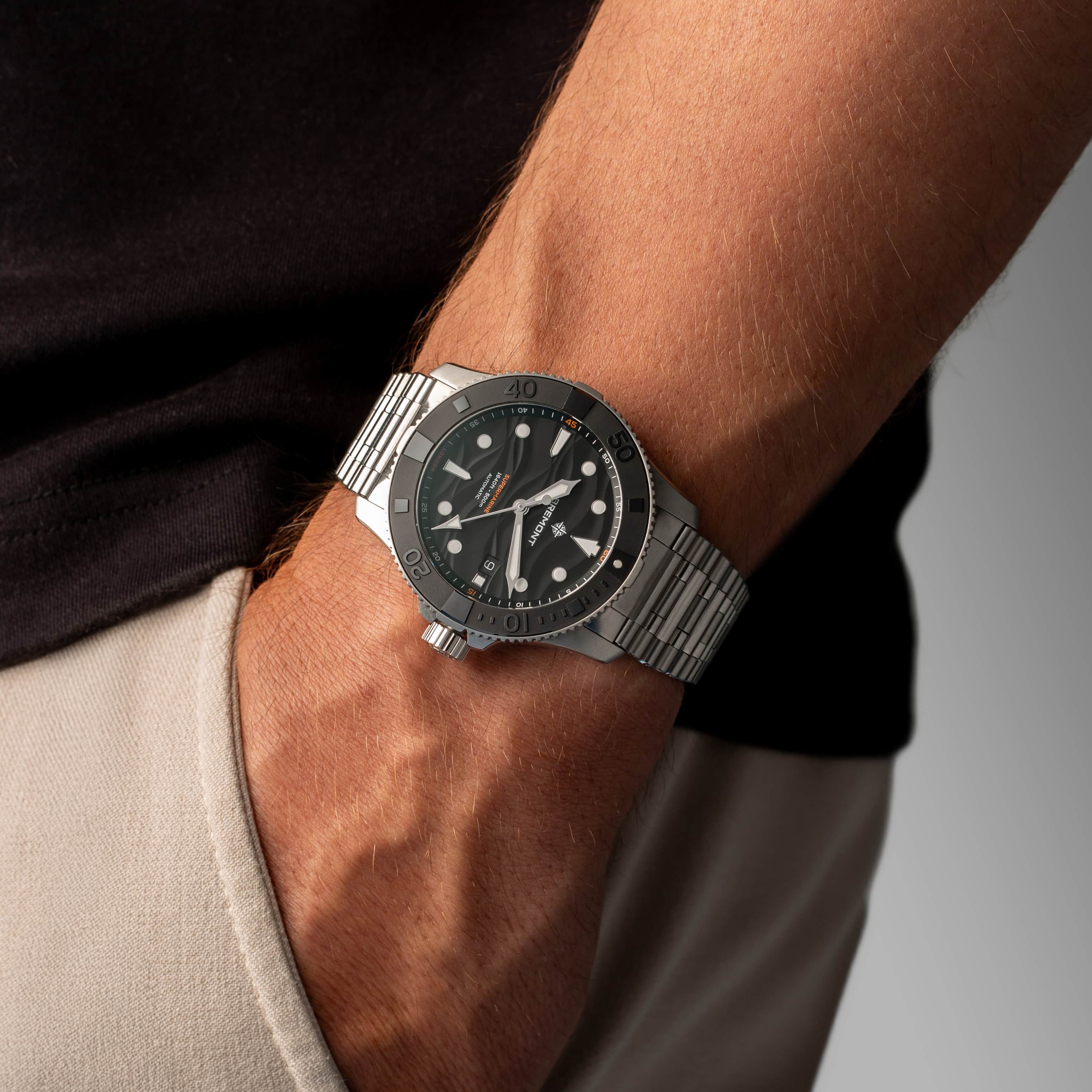 The Supermarine 500m marks a bold new chapter in Bremont’s professional dive watch collection. Crafted in 904L stainless steel, the 43mm case features a slimmer, more ergonomic profile with enhanced crown and bezel guards for added durability. Designed to withstand the pressures of deep-sea diving, it boasts a 500-metre water resistance rating, a helium escape valve, and a textured black ceramic uni-directional bezel.